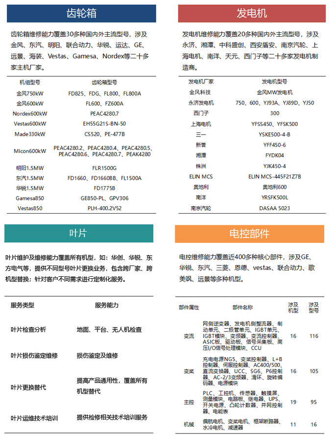 服务范围:目前已为多种风机品牌提供服务,详情如下:其中,叶片维护及维修能力覆盖所有机型。